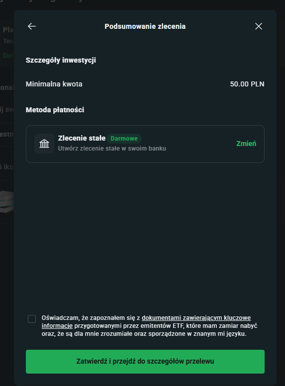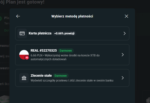 Podczas tworzenia planu ustalasz kwotę i metodę wpłaty – możesz zasilić plan od razu z salda XTB, kartą albo przelewem bankowym. Możesz też ustawić automatyczne, cykliczne wpłaty (np. co miesiąc określona kwota) – XTB obsługuje takie zlecenia przez kartę lub zwykły przelew ze stałym tytułem. Po wpływie środków system automatycznie kupi za nie ETF-y według ustalonych proporcji.