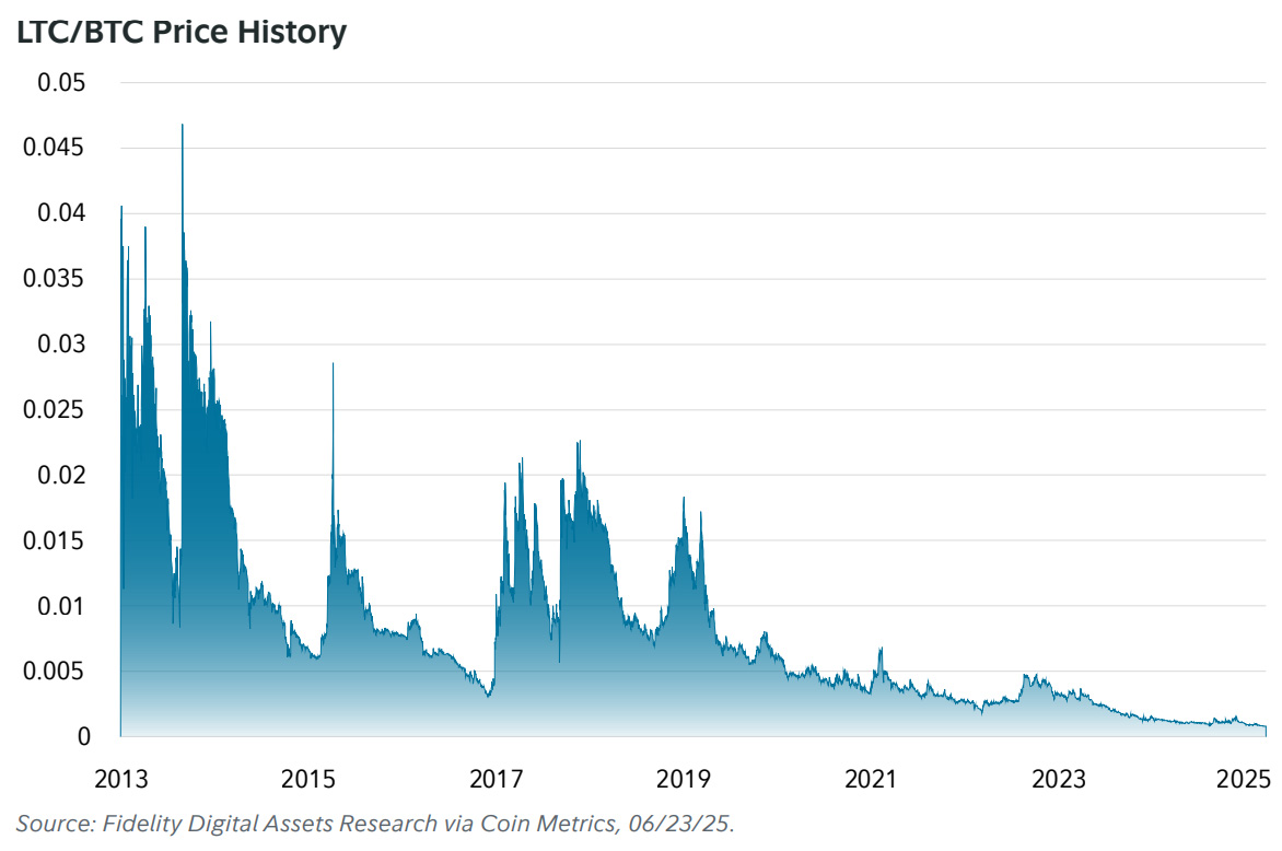 Wnioski? Na tle konkurencji kurs LTC nie zachwyca. Poradził sobie dobrze gdy inwestowali detaliści, gorzej gdy pałeczkę przejmują instytucje. Podczas hossy osiąga szczyt wcześniej niż BTC, co czyni go dobrym wskaźnikiem wyprzedzającym. Jego względna siła powoli maleje – każdy kolejny cykl pokazuje słabsze wyniki niż BTC i ETH.